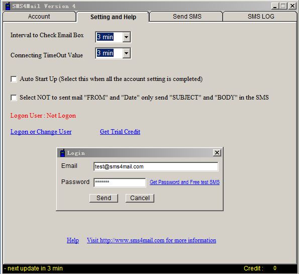 Click Logon or Change User from Setting and Help tab to login sms4mail.com for SMS sending. No Account ? Register here to get free sms to test