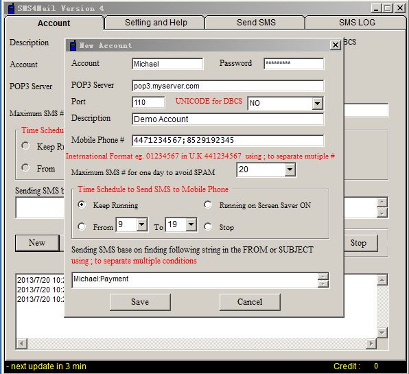 When you setup completed as above and save, program will convert email to sms and send to 4471234567 & 8529192345 if the incoming email 's "from" or "subject" have michael or payment