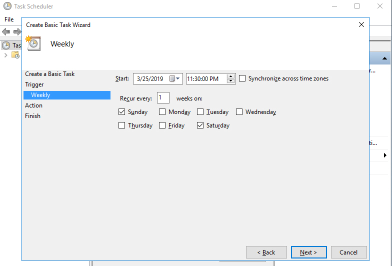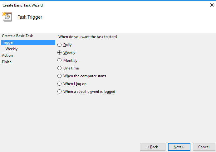 | 3. Select Daily/Weekly/Monthly/... then Next | 4. Put the date,time and frequency for the task then Next |
