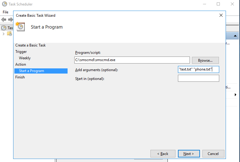 | 5. Select "Start a program" then Next | 6. Put your smscmd.exe and arguments then Next |